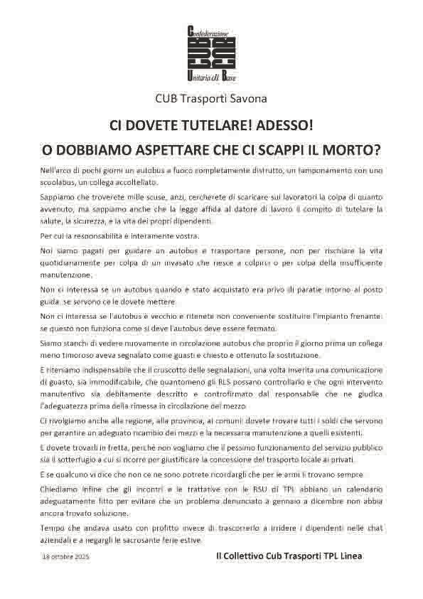 18 ottobre 2025 Il Collettivo Cub Trasporti TPL Linea